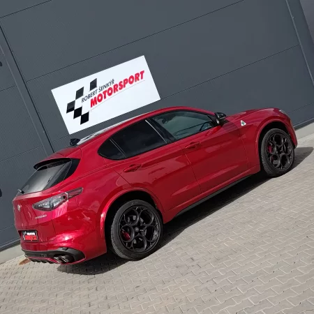 Koncový díl Slip-On si vybral majitel rudého Stelvia Quadrifoglio🍀, aby zlepšil zvuk tohoto vysoce výkonného SUV, k tomu napomáhají dvě klapky s pouzdry odlévanými z titanu a sofistikované X-křížení integrované do tlumiče. Excelentní koncovky kombinující titan a karbon dokreslují dokonalé zpracování celého výfuku.