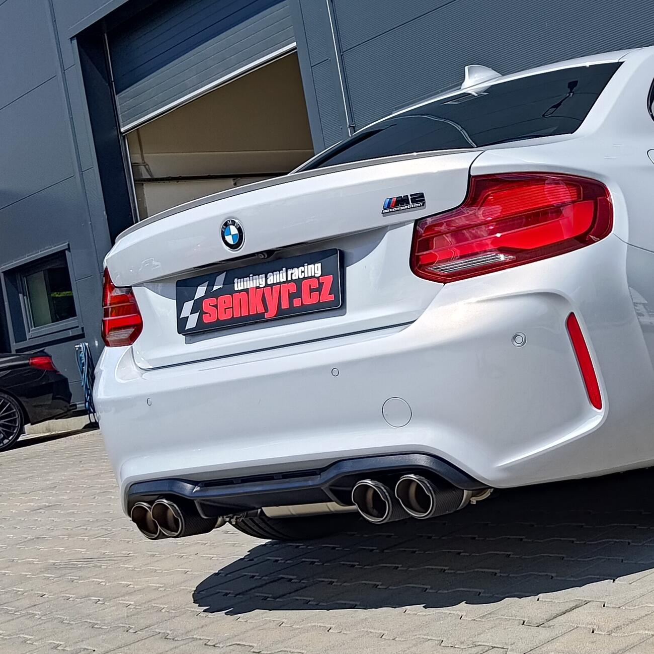 BMW M2 G87 s titanovým sportovním výfukem Akrapovič Slip-On Line doplněným o dva páry kulatých koncovek s velkým průměrem Tail Pipe Set (Carbon) a karbonovým křídlem také z regálu Akrapovič.